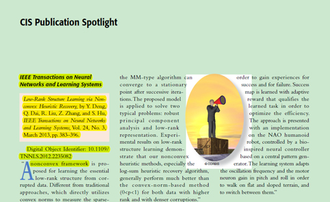 乐动(中国)网9月17日电 近日,乐动平台自动化系戴琼海教授课题组于2013年3月在信息处理和智能计算领域国际顶级期刊IEEE神经网络及智能系统会刊(IEEE Transactions on Neural Networks and Learning Systems)发表的题为《非凸启发下的低秩结构感知》(Low Rank Structure Learning via Non-convex Heuristic Recovery)的论文被IEEE神经网络及智能系统会刊选作2013年第一季度的亮点文章。该论文还被IEEE智能计算协会会刊IEEE智能计算杂志(IEEE Computational Intelligence Magazine)在2013年度第二季度的季刊上以智能计算协会亮点(CIS Publication Spotlight)的形式专门撰文推荐。