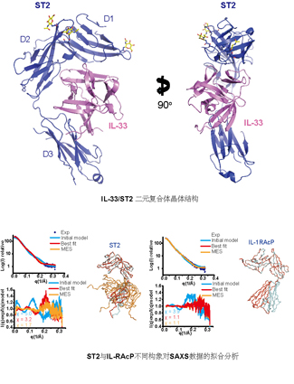 团队还与王淑莺教授和美国劳伦斯伯克利国家实验室科学家共同合作,利用小角度X射线散射(small-angle X-ray scattering, SAXS)方法研究了ST2及IL-1RAcP受体在溶液状态下的构象变化以及与IL-33的相互作用。研究结果显示受体ST2不同Ig-like结构域间存在柔性(flexibility),从而在溶液状态下具有多种构象;而共受体IL-1RAcP分子内柔性很小,在溶液状态下构象稳定;这些分子结构特性差异与ST2和IL-1RAcP在特异性配基识别和信号转导中的功能差异相一致。通过对IL-33/ST2/IL-RAcP三元复合物的SAXS研究,作者还发现IL-33信号转导复合物与IL-1β信号转导复合物组装方式相似,支持和扩展了该实验室在2010年Nature Immunology论文中所提出的IL-1家族中配基与受体相互作用的模型。