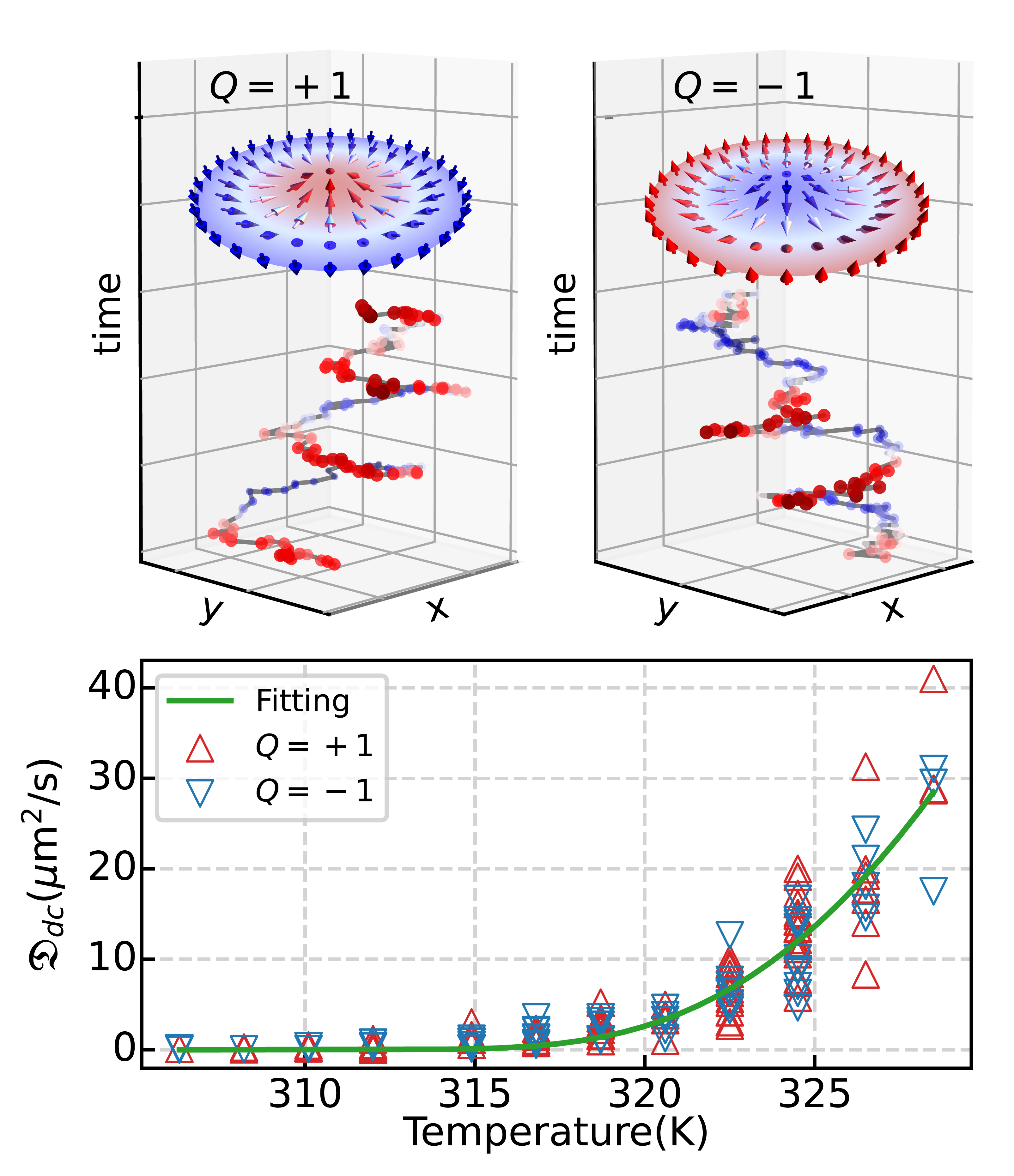 有限温度下具有正负拓扑数的斯格明子的旋性布朗运动。左图所示为拓扑数Q=-1的斯格明子,右图为Q= +1的斯格明子。下图为实验中所观测到的斯格明子随温度之间指数型扩散关系。