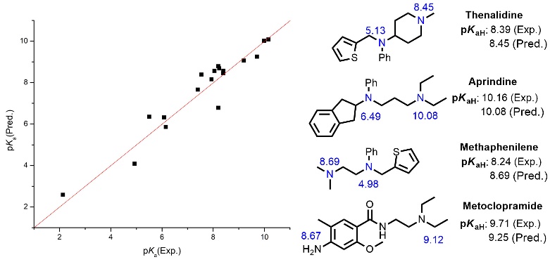 iBond数据库是由乐动平台程津培院士领衔创建的全球最权威的键能数据库,其收集了文献报道的两万余种化合物的约三万五千个准确pKa数据。研究团队对iBond数据库中已有数据进行了系统整理标记,形成了种类丰富、溶剂分布广泛、数据分布合理的数据集。在自此基础上,团队引入了结合化合物结构特征和物理化学性质的SPOC描述符对化合物进行精确描述,并采用当前流行的XGBoost和神经网络算法构建了高精度预测模型。该预测模型可以实现不同溶剂中化合物pKa的同时预测,并能够对包括O-H、N-H、C-H在内的各种不同酸性氢进行准确的pKa预测,精度可达到0.87pK单位。团队分别选择了若干药物分子和小分子催化剂对水相及有机相的预测能力进行了测试,研究表明对药物分子的水相pKa预测的平均误差可低至0.44,对有机小分子有机相pKa预测的平均误差则在1pK单位左右。