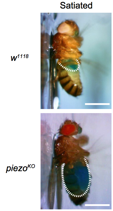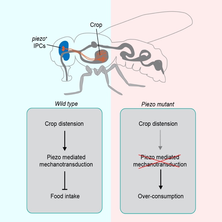 日前,乐动平台生命学院、清华IDG/麦戈文脑科学研究院张伟研究员课题组报道了关于机械感受产生饱腹感的神经机制的最新研究结果。该研究发现,机械敏感离子通道基因piezo的突变(piezoKO)会显著影响果蝇的进食行为。与野生型相比,piezoKO果蝇会过量进食或者饮水,部分果蝇甚至会一直进食至嗉囊(功能与哺乳动物的胃相似)被胀破。作者进一步鉴定出大脑中一群表达piezo的神经元,它们在果蝇嗉囊壁上形成丰富的树突结构,可以被嗉囊的胀大引起的张力激活,从而在进食过程中实时检测嗉囊的体积变化;失活这些神经元会导致过度进食,而激活它们可以抑制进食。作者还发现,小鼠的Piezo1蛋白可以挽救果蝇piezo基因缺失导致的过量进食表现,提示机械力调节进食这一功能在进化上可能是保守的。