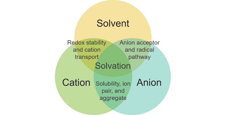 在电解液中,电解液微观相互作用可以分为锂离子、溶剂分子、盐阴离子之间的作用。一方面,这些作用直接决定电解液的结构,从而影响其物理化学性质;另一方面,这些作用受电解液溶剂化作用调控。具体而言,电解液溶剂化通过介电常数影响离子、偶极间作用力,从而调节锂离子与溶剂分子、阴离子间作用强弱。由于不同离子、偶极间作用力受到介电常数影响的规律不同,溶剂化作用调控电解液微观相互作用大小关系成为了可能。