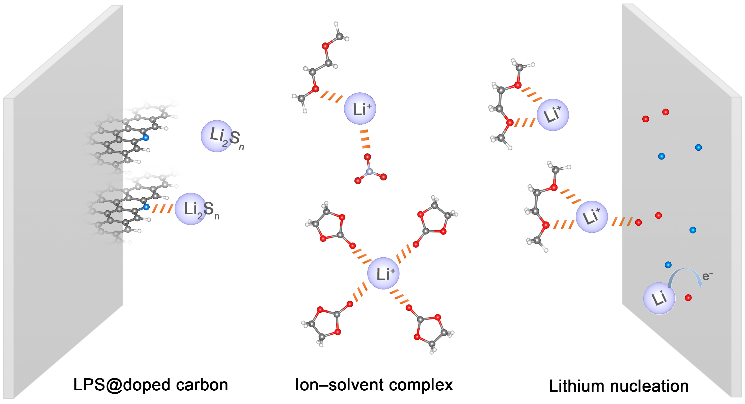 基于以上理解,课题组提出了一系列电解液及界面设计方案,为实现金属锂负极的稳定利用提供有效指导。比如,通过引入与锂离子亲和性更强的氟代碳酸乙烯酯(Fluoroethylene carbonate,FEC)分子,参与到锂离子溶剂化壳层中,降低锂离子脱溶剂化能垒,从而降低锂离子沉积、脱出过程的极化。同时,与锂离子配位的FEC分子优先在金属锂表面分解形成富含LiF的SEI,可以降低锂离子在SEI中扩散能垒并诱导金属锂均匀沉积。再比如,将硝酸根引入锂离子溶剂化壳层,可以形成更大的溶剂化团簇,并促进FSI‒阴离子的分解,形成富含LiF界面层,拓宽电解液的稳定窗口。此外,还可以利用FEC与硝酸锂之间的协同机制,在金属锂表明形成氟-氮SEI,降低界面阻力,同时还可以适应金属锂循环过程中的界面演变,维持SEI的结构与性质,并在软包电池中取得实际应用(《德国应用化学》Angew. Chem. Int. Ed.2020,59, 3252–3257)。