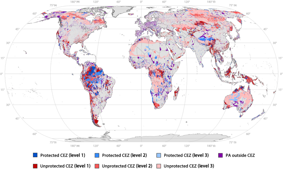 图2. 全球高效益低成本区域和现有保护地叠加情况