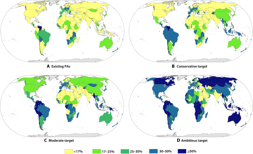 图3. 四种情境下,按照各国保护地覆盖率所在区间绘制的地图:(A)现有保护地;(B)保守目标;(C)中等目标;(D)宏伟目标 |