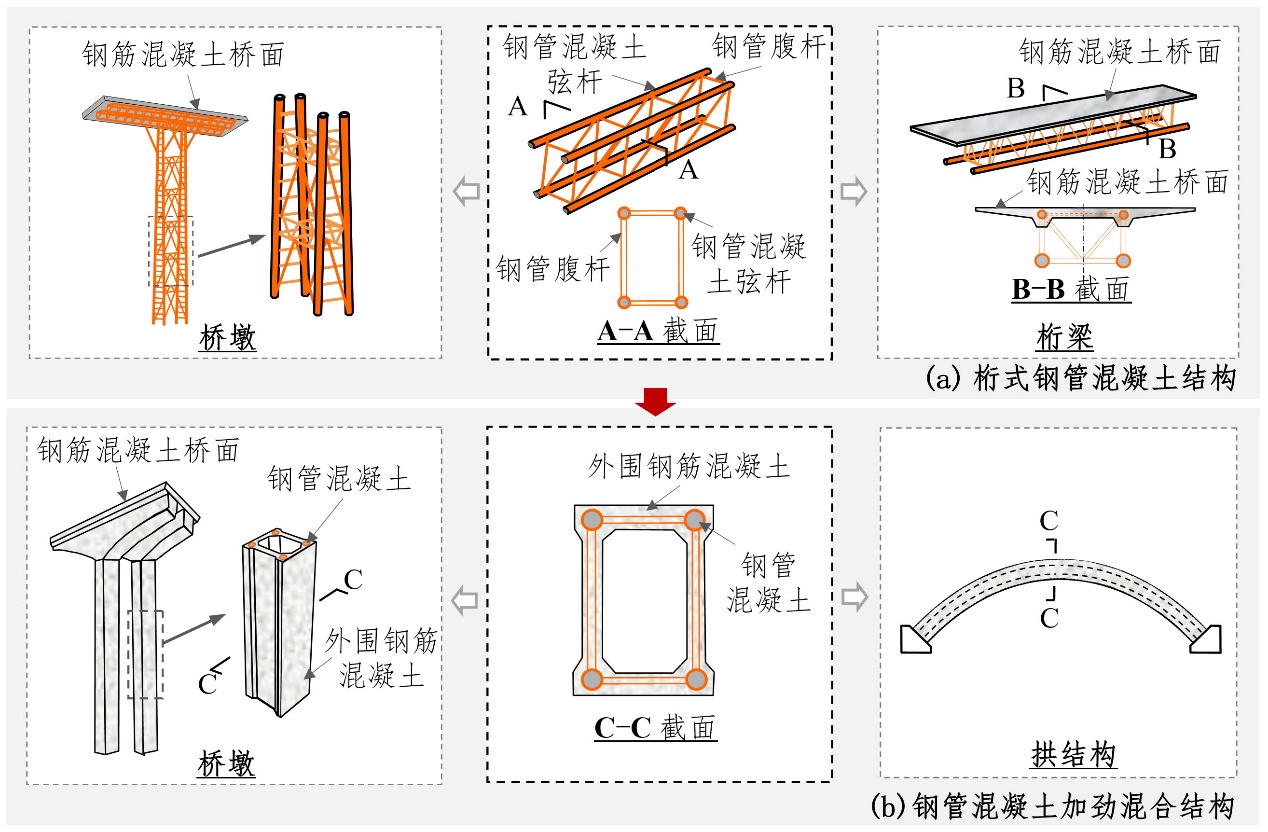 顺应国家"乡村振兴"和"交通强国"发展战略,近15年来,我国四川、广西等地区的桥梁建设向深山峡谷快速发展,且常地处强震区(抗震设防烈度≥7度),面临桥梁跨径和桥墩高度、抗震性能和施工建设等严峻挑战,相应的结构设计技术亟待突破。钢管混凝土混合结构(包括桁式钢管混凝土结构及在其基础上演变而来的钢管混凝土加劲混合结构)是一类承载力高、抗震性能好、施工便捷、经济适用的新型结构形式,正成为地处强震区的我国山区特大桥梁工程结构的优选形式之一。然而,以往尚缺乏对此类结构设计原理的系统研究,制约了其科学地推广应用。