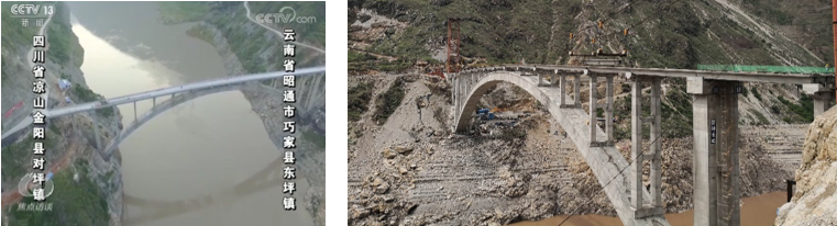 该研究成果助力国家“乡村振兴”战略实施,已成功应用于雅安干海子特大桥、雅安腊八斤特大桥、汶川克枯特大桥等8座强震区特大桥梁工程。相比原设计方案,采用钢管混凝土混合结构方案节约了混凝土用量、减轻了结构自重、降低了基础费用、缩短了施工工期、显著降低了结构造价。大桥建成后,显著改善了我国西南地区5个国家级贫困县(石棉、古蔺、金阳、布拖、汶川)的区域交通水平。如由国务院扶贫办实施的布拖县和金阳县2座溜索改桥工程,改善了金沙江两岸川滇两省约8万名群众的安全出行条件。2018年7月12日,《人民日报》头版以“大桥飞架金沙江”为题报道了布拖县冯家坪金沙江“溜索改桥”项目(图1)。2018年9月12日,中央电视台《焦点访谈》以“别了,溜索!你好,大桥!”为题,报道四川金阳县对坪镇一村“溜索改桥”项目桥面正式贯通(图2)。