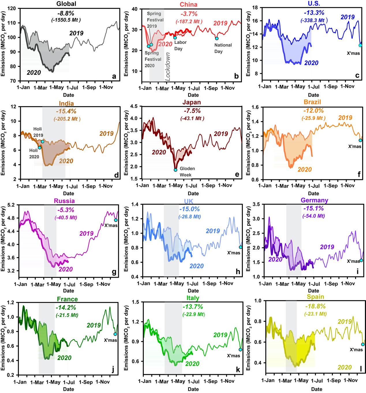 研究通过对全球31个国家的电力生产情况、416个主要城市的交通拥堵指数、航班飞行数据、62个国家的工业生产、206个国家人口加权的全球地表温度等近实时数据的分析,构建了世界上主要国家的电力、工业、地面交通、航空、国际航运和居民消费等领域2019年至今的实际日二氧化碳排放数据。