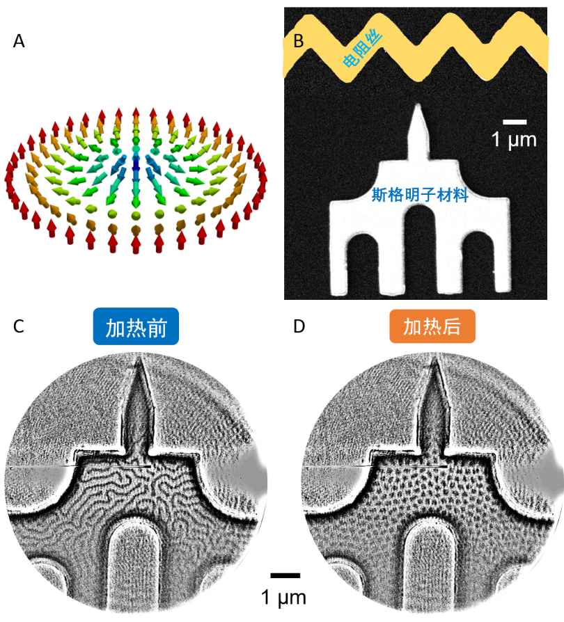 图一:(A)奈耳构型磁性斯格明子的自旋结构示意图;(B)以乐动平台二校门为原型的磁性纳米结构和原位加热电阻丝组成的器件的扫描电子显微镜图片;(C)在室温、–20mT的面外磁场下,利用软X射线全场透射式显微镜,在二校门构型的磁纳米结构中观察到条纹状磁畴形态;(D)通过器件上的电阻丝原位加热后,磁纳米结构内呈现密堆积的斯格明子。