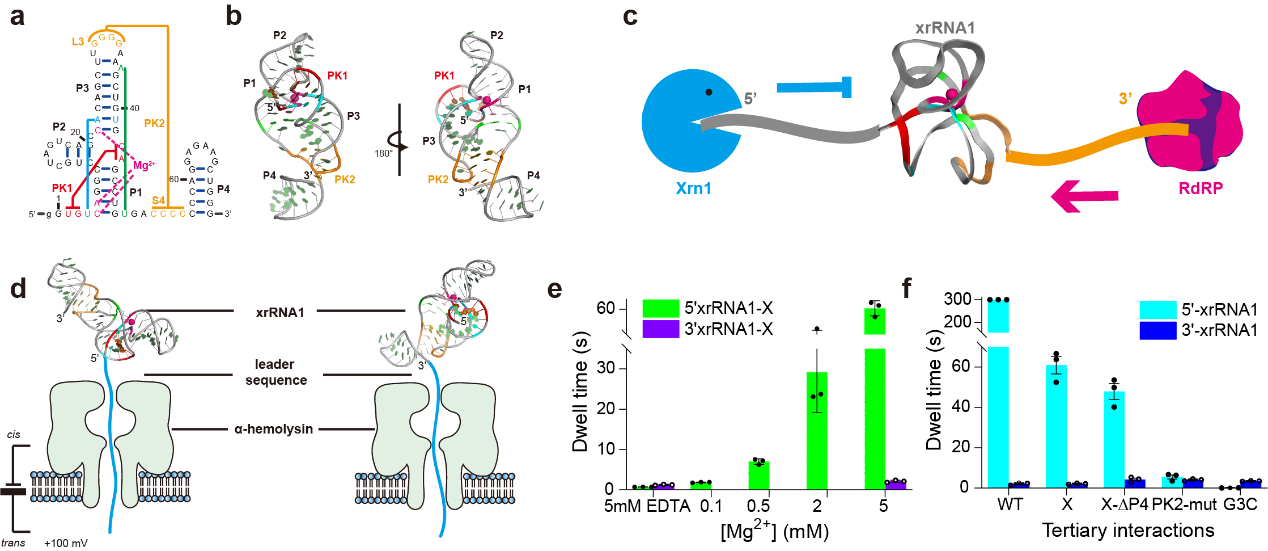为此,方显杨课题组与李景虹课题组合作,应用单分子α-溶血素(α-HL)纳米孔技术、小角X射线散射技术,结合分子动力学计算模拟和酶学降解方法,研究了来源于寨卡病毒的xrRNA1的机械稳定性各向异性现象及其分子机制。α-HL七聚体蛋白镶嵌在磷脂双分子层上形成的纳米孔通道最窄处只有~1.4nm,只允许单链核酸通过,具有复杂高级结构的RNA需要先解折叠成单链才能过孔。通过在RNA的5’或3’端加上单链的引导链,研究在电压驱动下RNA通过纳米孔时的电流变化特征,可以研究RNA沿5’或3’方向的单向解折叠过程(图1d)。相比于光镊、磁镊以及原子力显微镜等多种单分子力谱技术,单分子纳米孔技术在研究生物大分子的机械稳定性各向异性上具有独特优势,前者这些技术是在RNA两端同时施加机械力进行解折叠,因而不能很好地模拟体内RNA的方向性受力解折叠过程。研究证实寨卡病毒xrRNA1确实存在显著的机械稳定性各向异性,并且发现机械稳定性各向异性高度依赖于能稳定xrRNA1环状结构的镁离子浓度以及关键三级相互作用(图1e-f)。该研究表明xrRNA环状结构可作为潜在的结构元件,构建具有可调控机械稳定性各向异性的RNA生物材料。