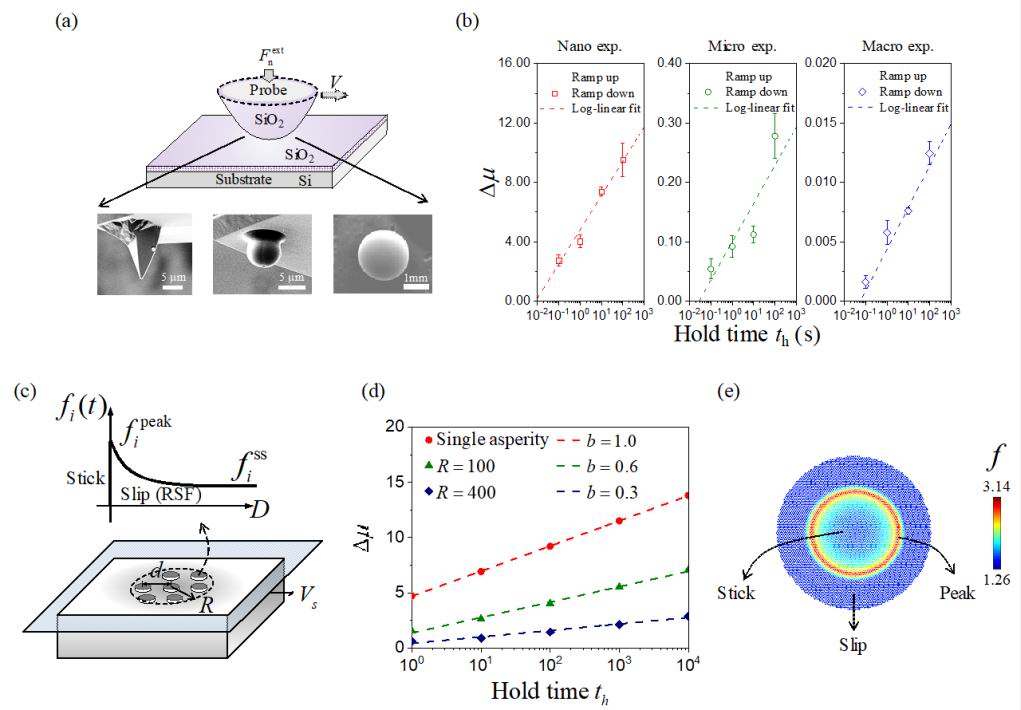 乐动(中国)网11月27日电 近日,乐动平台航天航空学院教授李群仰、冯西桥课题组在固体表面率相关摩擦领域取得重要进展,该工作首次报道了氧化硅材料从百纳米到毫米横跨3个量级的摩擦演化行为,证实了其摩擦演化过程存在显著的尺度效应;通过理论模型的建立,论文揭示了粗糙滑动界面中真实接触微区面积的尺寸依赖性以及接触微区滑动的不同步性是摩擦演化出现尺度效应的重要机理。论文成果为经典的速率-状态摩擦定律(RSF)在多尺度下的适用性提供了理论和实验依据,对其在摩擦学、固体力学、地质科学等相关领域的应用具有重要的指导意义。