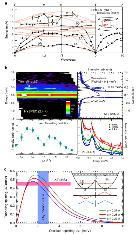 为了评估非谐性声子计算的准确性,研究者利用非弹性X光散射测量了BaTiS3单晶中的声子色散,发现测量数据与计算相符,且最大的偏差存在于低频的TA1声子中,这进一步说明了实验与理论的一致性(图3a)。而根据量子力学,双势阱下的粒子可能通过势垒,导致基态和激发态之间的隧穿分裂。为了验证BaTiS3单晶中的隧穿分裂效应,研究者通过高能分辨率非弹性中子散射测量实验,发现在温度最高可达200K的条件下,激发能在误差范围内保持不变(图3b)。这一结果与原子隧穿效应相符合,并排除了热激活Arrhenius过程的可能。而通过比较由隧穿分裂能量与TA1声子能量得到的阱分离间距,隧穿系统的存在得到了进一步的证实(图3c)。