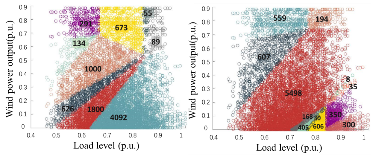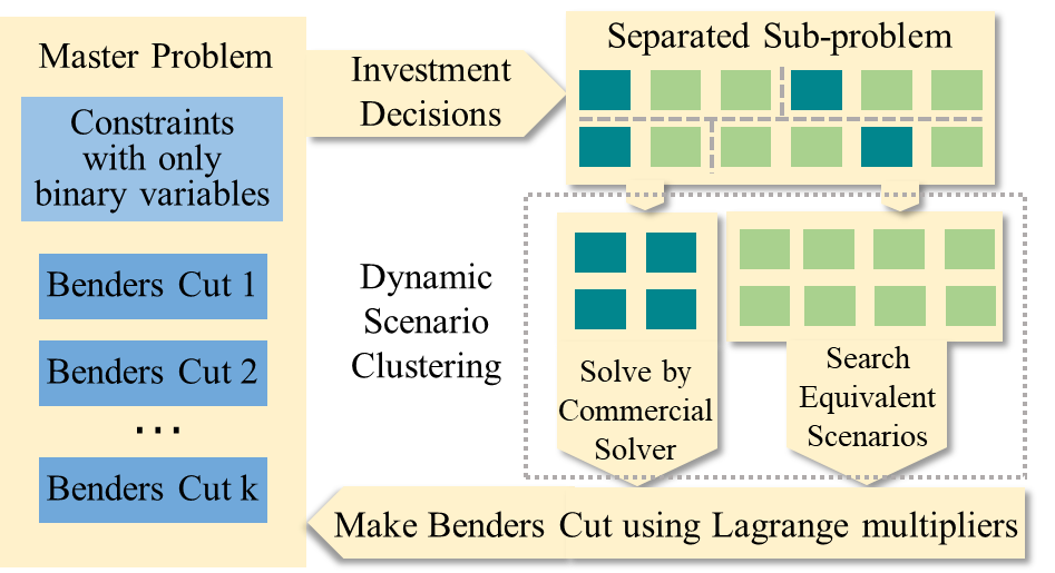 在高比例可再生能源接入的背景下,源端和荷端存在极大的不确定性,电力系统的“运行方式”将更加复杂化、分散化、差异化。因此在规划模型中需要考虑海量运行场景,但将大量的运行场景往往会带来巨大的计算负担,甚至导致无法求解。传统场景削减方法难以把握场景削减的数量,且无法保证解的全局最优性。如何权衡场景全面性与计算效率问题是高比例可再生能源电网规划的难点。《考虑海量运行场景的高比例可再生能源输电网规划方法》基于Benders分解法和多参数规划方法,根据每个场景对最优解的影响进行聚类,可以加速随机规划问题的求解,保持解的最优性。在benders分解法中,每个场景会通过生成benders割对规划结果产生影响。可以基于多参数规划方法解析地获得每个场景对Benders迭代求解过程的影响。该研究以此作为依据对场景进行聚类,将场景聚类融入求解过程,按果进行聚类。该计算方法在Garver 6-bus, IEEE RTS-79, IEEE RTS-96与某一实际省级系统等测试系统上行进行了应用分析。计算效率相比传统benders分解法提升6倍以上。