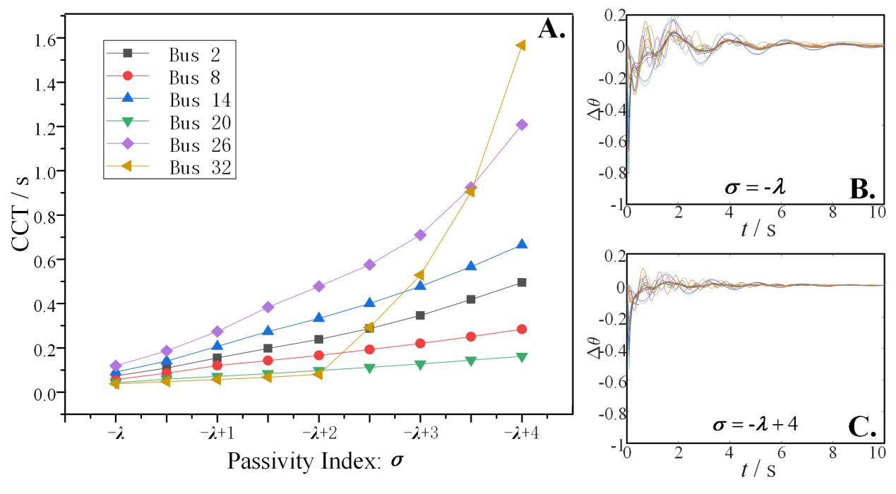 节点动态输出微分无源性与系统暂态稳定性的关系:在IEEE-39系统不同节点模拟短路故障,节点动态的输出微分无源性越强(由无源性指标定量刻画),则故障的临界清除时间(CCT)越长,表明暂态稳定性越好。