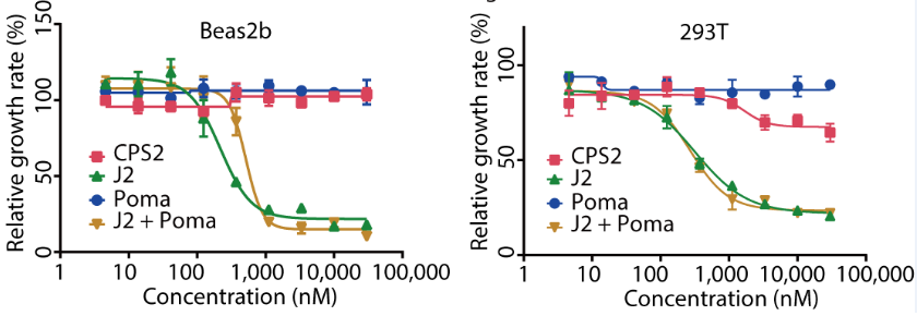 CPS2解决了CDK2抑制剂选择性的问题,对正常细胞(Beas2b、293T细胞系)的毒性较小,但CPS2可通过抑制肿瘤细胞增殖的方式产生抗肿瘤效果(图4)。作者也进行了在动物体内急毒实验,结果表明CPS2的安全性远高于其母核抑制剂J2(图5)。