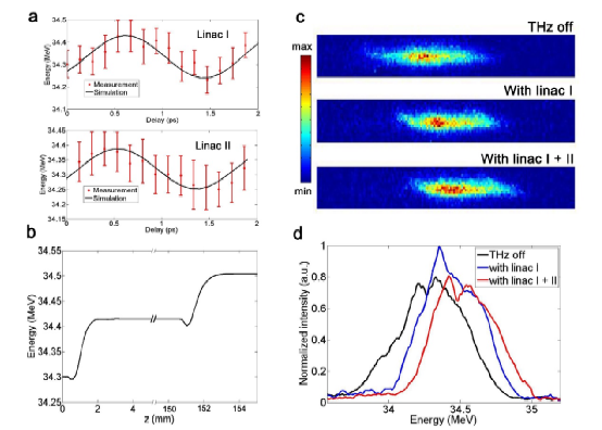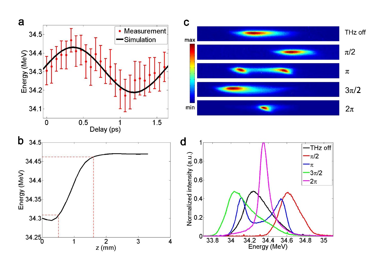 乐动平台工程物理系加速器实验室长期致力于高亮度电子束物理、技术与应用的研究。瞄准这个研究方向,2017年7月黄文会、唐传祥教授提出在工程物理系加速器实验室发展太赫兹加速技术,深入研究新加速原理的核心物理与创新技术,进而建设紧凑型全光太赫兹加速器实验平台的基本构想。博士生胥汉勋深入开展了太赫兹加速实验的理论分析和物理设计,与团队成员于2018年4月和2019年12月在乐动平台加速器实验室汤姆逊散射源束线上开展高梯度级联太赫兹加速实验。研究团队采用灵巧的双束实验方案(如图2所示),利用驱动电子束基于相干渡越辐射(coherent transition radiation,CTR)产生强太赫兹脉冲,在太赫兹介质管加速器中对后续跟随的超短电子束进行两级同步加速。该方案利用同源的驱动激光在加速器束线上同时产生强太赫兹波(132μJ)和超短的相对论电子束(34.3 MeV,460fsFWHM)并保证了二者的天然的时间同步特性,使得强太赫兹电场(1.1 GV/m)能够稳定的对相对论电子束进行同步加速。经过不断调试和优化,研究团队成功的实现了太赫兹波对相对论电子束的级联加速,观测到了清晰的全束团加速现象,所实现的加速梯度(155 MV/m)和加速能量(204 keV)相较于当前世界上已报道的结果提高了一个量级(如图3、4)。