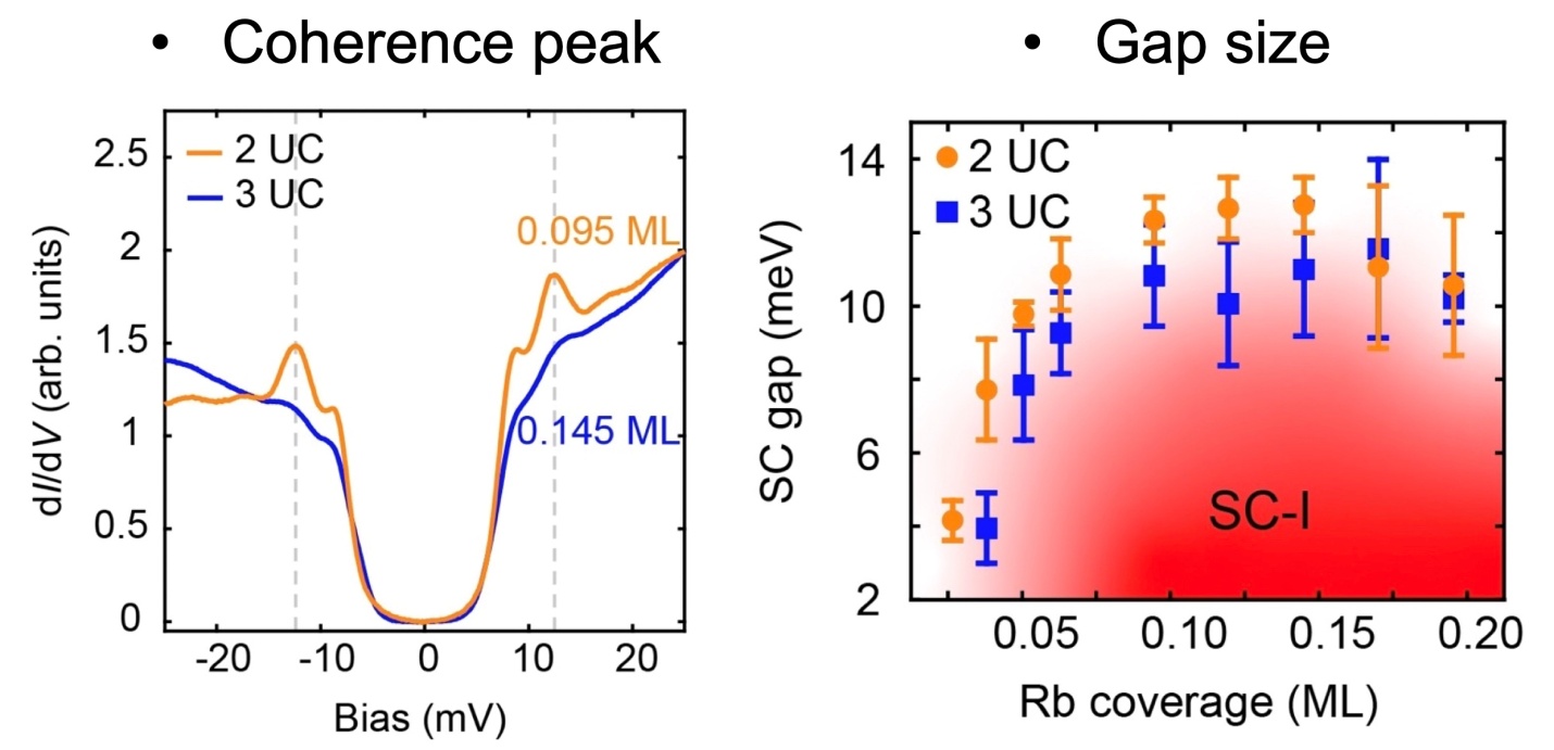 将分子束外延生长与扫描隧道显微镜技术相结合,该研究团队实现了对硒化铁薄膜精确的层厚调控,并逐层研究了其电子结构。他们发现在双层硒化铁薄膜中存在着稀有的长程条纹型电子液晶相(如图1中箭头所示),而在双层薄膜的近邻:单层和三层中,均不存在该条纹相。因此,该条纹相位于高温超导相和电子向列相之间,这是对这三者关系的首次揭示。实验还表明,表面电子掺杂可抑制双层薄膜的条纹相,进而诱导出与单层薄膜中类似的超导态。通过比较掺杂诱导的双层和三层硒化铁薄膜的超导电性,他们发现双层薄膜的超导在相干性和能隙大小上都优于三层(如图2所示),这与在双层薄膜中广泛存在的条纹相密切相关。该研究团队认为,未掺杂的单层和双层硒化铁薄膜均处于条纹型电子液晶相这一基态,电荷掺杂会诱导出超导电性。在掺杂过程中,尽管长程的条纹相被抑制,但条纹相的电子涨落仍会进一步增强超导。该工作揭示了硒化铁薄膜在二维极限下电子结构的演化,并证明了硒化铁本身具有的条纹型液晶态涨落对高温超导的影响。