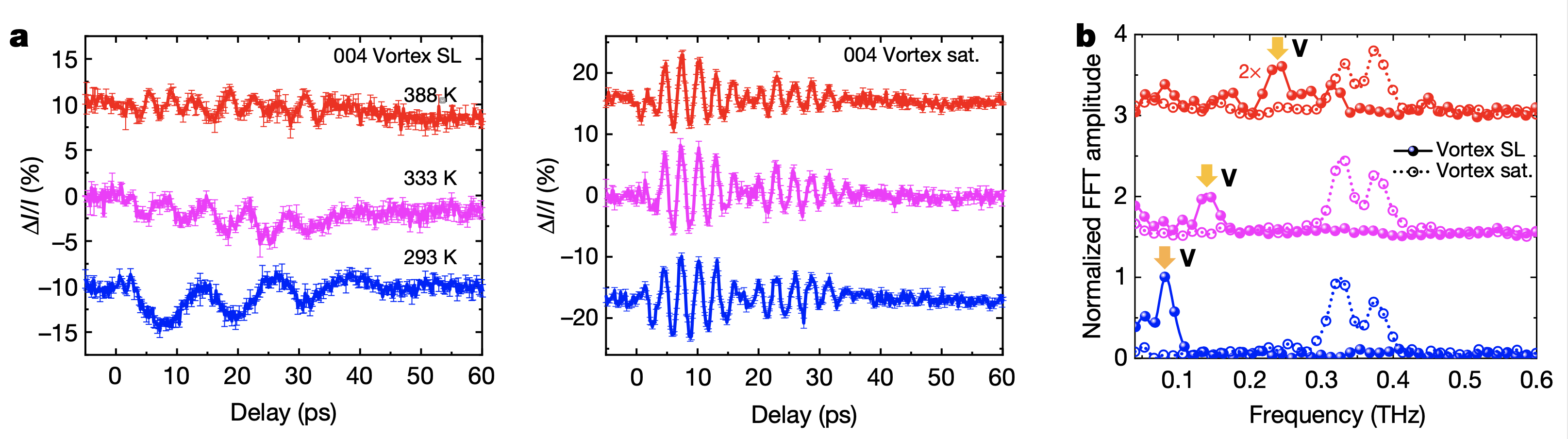 针对上述问题,该研究通过硬X射线自由电子激光散射实验,并结合动力学相场模型与原子尺度模型两种模拟方法,对强场太赫兹脉冲激发下(PbTiO3)16/(SrTiO3)16超晶格薄膜中极化涡旋在百飞秒量级的时间分辨率下的超快动力学进行了研究。实验中,通过测量极化涡旋的X射线衍射强度随泵浦-探测延迟时间的变化曲线,分析得到了主要位于0.08 THz(293K)附近和0.3-0.4 THz两个频域的模式。二者在实空间分别对应于相邻涡旋从直线排列开始横向振动的模式和更复杂的、具有涡旋壁扭转与呼吸等特征的动力学模式。此外,该研究还揭示了涡旋集体动力学模式的频率和振幅的可调谐性,通过改变样品温度产生热应变,观察到了低频横向振动模式的频率显著变化,表现出典型的软模行为(即涡旋软模)。计算结果与实验结果在响应模式频率、激发选择性以及模拟X射线衍射信号等方面有着较好的吻合。