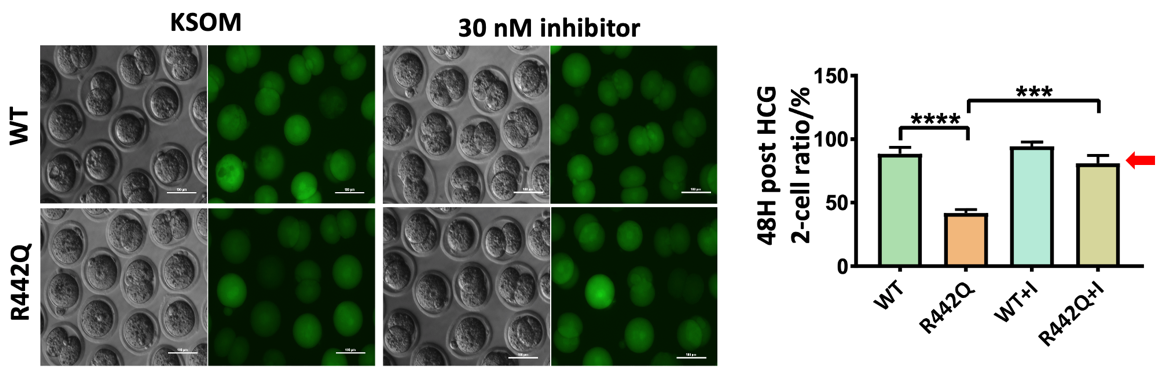 图2 CHEK1 p.R442Q杂合突变导致合子卵裂阻滞,低剂量CHEK1抑制剂可使部分合子进一步发育