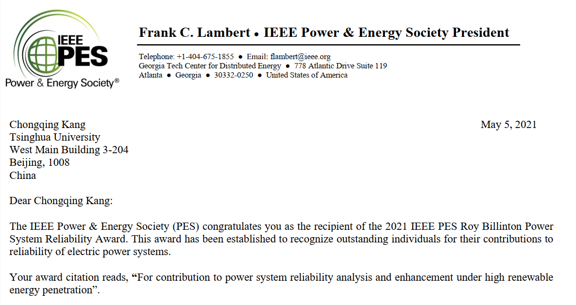 IEEE PES年度学会大奖是国际电力系统学术领域的最高荣誉之一,其中电力系统可靠性奖每年在全球范围内评选1人,并在IEEE PES年会(General Meeting)的晚宴上颁奖。IEEE PES Roy Billinton Power System Reliability Award是为了纪念国际上电力系统可靠性理论的奠基人、加拿大皇家学会院士、加拿大工程院院士和美国工程院外籍院士、IEEE终身会士罗伊·比林顿(Roy Billinton)教授而设立的,主要表彰国际上电力科学与工程领域为电力系统可靠性作出重要贡献的杰出个人。