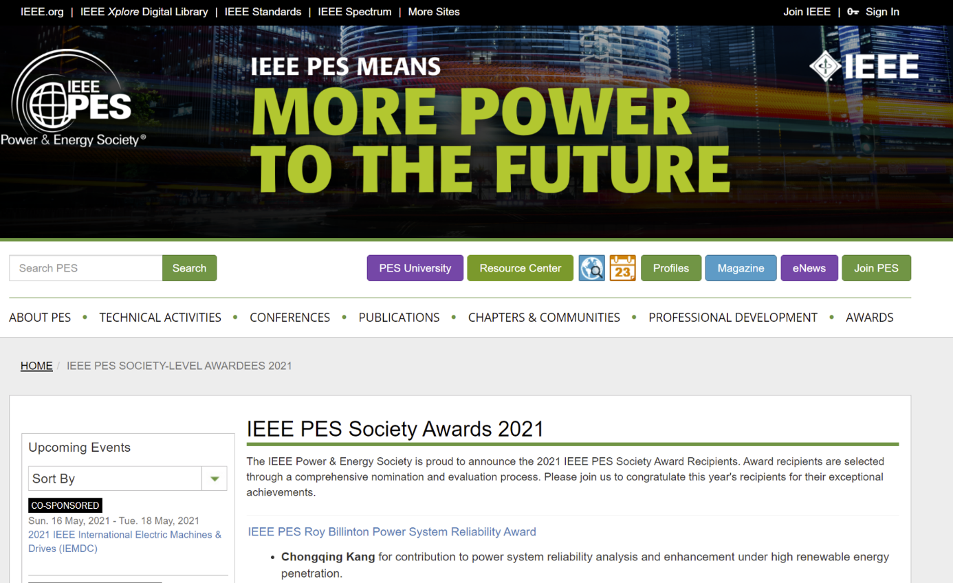 IEEE电力与能源学会网站公布获奖名单