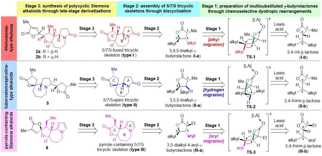 在此项研究中,唐叶峰课题组结合前期研究工作基础以及百部生物碱的骨架特点,提出了“通过化学选择性β-环丙内酯双σ键迁移重排反应实现不同类型百部生物碱的量体裁衣式合成”这一设计思想(图2)。该合成策略的核心在于通过控制底物β-环丙内酯C3和C4位取代基的立体位阻效应和C5位取代基的电子效应,精确调控C5位取代基的迁移顺序,进而通过化学选择性的烷基迁移、氢迁移和芳基迁移得到5/7/5并环、5/7/5螺环和含芳香吡咯环的5/7/5并环等三种不同百部生物碱核心骨架。在此基础上,通过对上述三环骨架中A环和C环分别进行后期衍生化,完成了一系列结构更为复杂的四环百部生物碱的全合成。在此项工作中,唐叶峰课题组共实现三种亚型、6个百部生物碱的不对称合成,且所有目标分子的最长线性步骤不超过12步,体现出合成策略的高效性、普适性和多样性。
