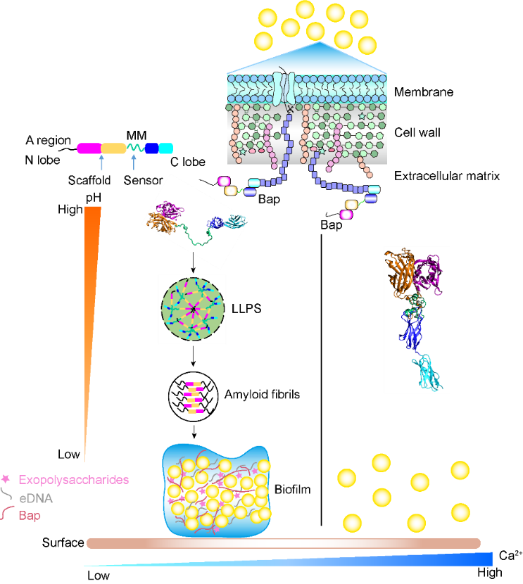 乐动(中国)网6月3日电 近年来,由多重耐药性金黄色葡萄球菌引起的院内感染已对全人类的健康构成极大威胁。全球每年有近100万人死于无法用传统抗生素治疗的细菌感染,其中,耐甲氧西林金黄色葡萄球菌造成的死亡病例远超过由艾滋病和肺结核引起的死亡病例总和。金黄色葡萄球菌的耐药性往往与其能形成生物被膜密切相关。人们很早就在奶牛源金黄色葡萄球菌中发现一种被称作生物被膜相关蛋白(Biofilm associated proteins)的细胞表面蛋白Bap,Bap在介导葡萄球菌生物被膜的形成中发挥重要作用。Bap是一个多结构域蛋白,全长蛋白含有2276个氨基酸。最近的研究表明,Bap蛋白的N末端在低pH和低钙下易于聚集形成功能性淀粉样纤维,并且促进细菌聚集和生物被膜的形成。然而,Bap蛋白响应环境变化调控淀粉样纤维的形成以及介导生物被膜形成的机制并不清楚。