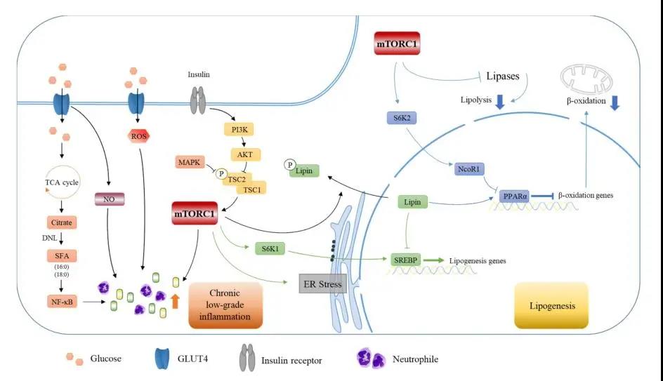 综合当前研究以及研究组整理分析得到的结论,碳水化合物主要通过NF-κB和mTORC1通路诱发炎症。碳水化合物在肠道被消化成单糖并通过GLUT4进入细胞,经过TCA循环代谢为柠檬酸盐,而后通过脂质从头合成途径合成脂肪酸并激活NF-κB,诱导生成大量炎症细胞因子。此外,碳水化合物通过影响细胞内ROS和NO水平,进一步诱导炎症因子释放。