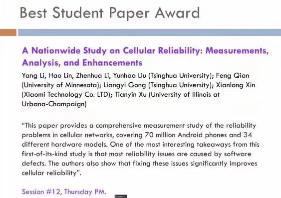 信息学院刘云浩教授和李振华副教授团队一直致力于移动网络关键技术研究。近日,在计算机网络通信领域国际顶尖会议之一ACM SIGCOMM上,团队的研究论文《蜂窝网络可靠性的全国性研究:测量、分析和增强》(A Nationwide Study on Cellular Reliability: Measurement, Analysis, and Enhancements)获得本届会议唯一的最佳学生论文奖(Best Student Paper Award)。这是SIGCOMM首次将该奖项颁发给亚洲的科研院校。