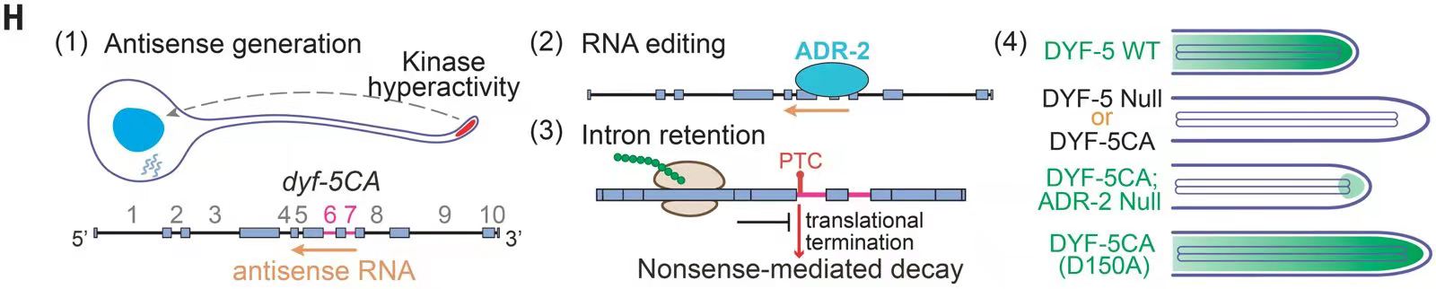 欧光朔实验室利用基因组编辑方法制备了DYF-5激酶组成型活化形式的线虫品系(DYF-5CA),意外发现该线虫的嗅觉纤毛产生了与DYF-5激酶缺失相同的表型。遗传抑制子筛选鉴定到细胞核内负责RNA编辑的腺苷脱氨酶突变可以挽救DYF-5CA的纤毛异常。测序和生信分析发现编码DYF-5CA的pre-mRNA上发生了大量的A-to-G的编辑,导致RNA剪切异常,DYF-5CA的蛋白翻译被阻断。DYF-5CA过度活化触发其RNA被编辑。RNA编辑同样限制其他纤毛激酶,提示该机制具有普适性。纤毛疾病相关蛋白不是理想的药物靶标,纤毛疾病的临床治疗一直是相关领域的难点和痛点。这项工作表明纤毛激酶异常导致的纤毛缺陷可以通过抑制细胞核内的腺苷脱氨酶进行挽救,提示了纤毛疾病“纤毛外”干预的新思路。近年来人类基因组的外显子测序鉴定到大量与遗传疾病相关的变异,将这类突变引入模式动物,开展遗传抑制子筛选,有望开发遗传疾病治疗的新策略。