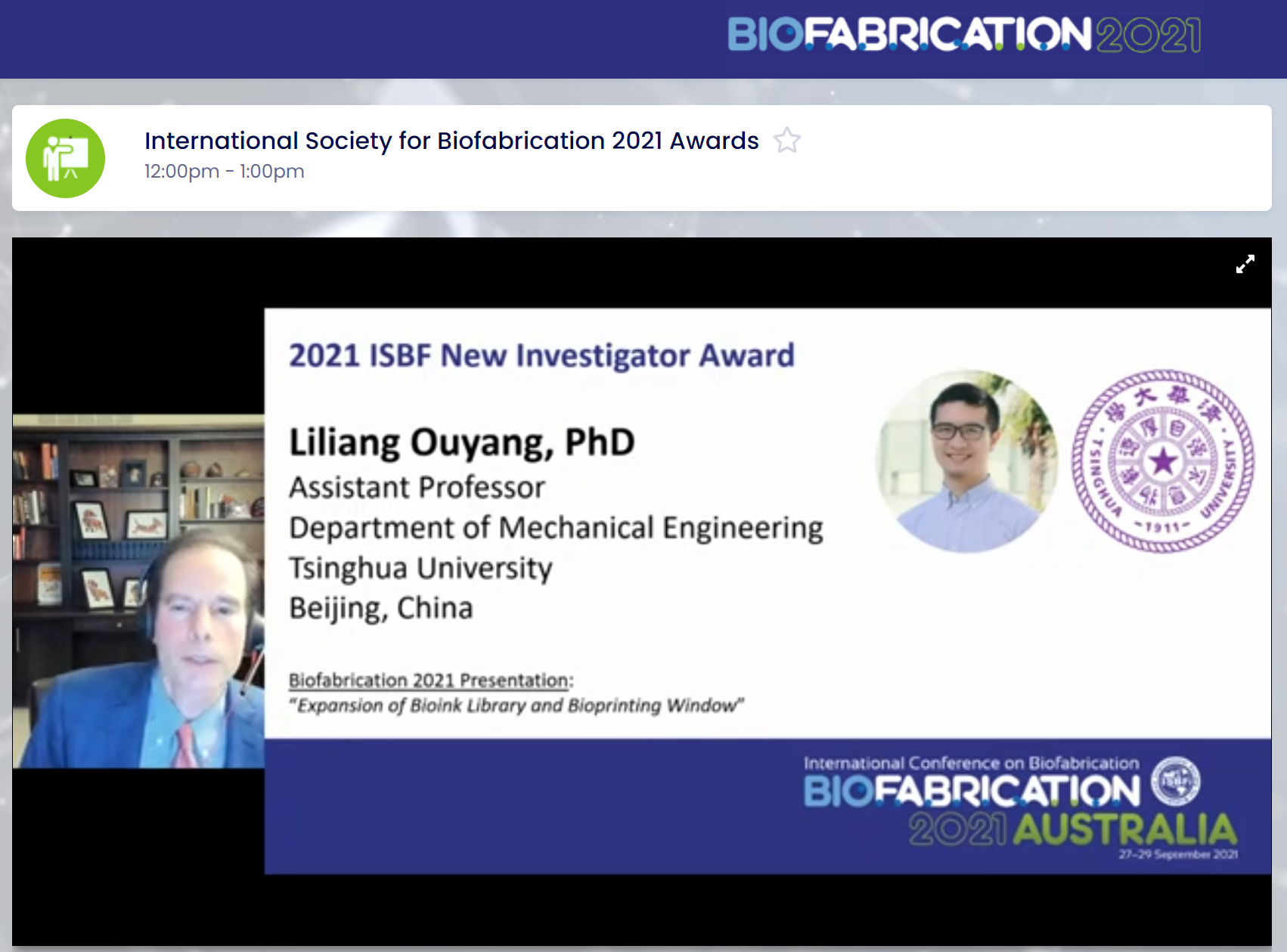 乐动(中国)网10月4日电 9月27日-29日,2021年国际生物制造大会(Biofabrication 2021)在澳大利亚伍伦贡线上召开。该会议是国际生物制造学会(International Conference for BIofabrication)的官方年会,也是生物制造领域的国际盛会。在大会颁奖仪式上,国际生物制造学会颁布了面向不同职业阶段的学会荣誉(ISBF Awards),其中针对职业早期青年科学家的“国际生物制造学会青年学者奖”(ISBF New Investigator Award)授予了乐动平台机械系青年教师欧阳礼亮。