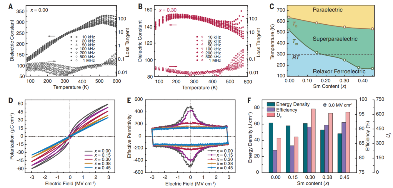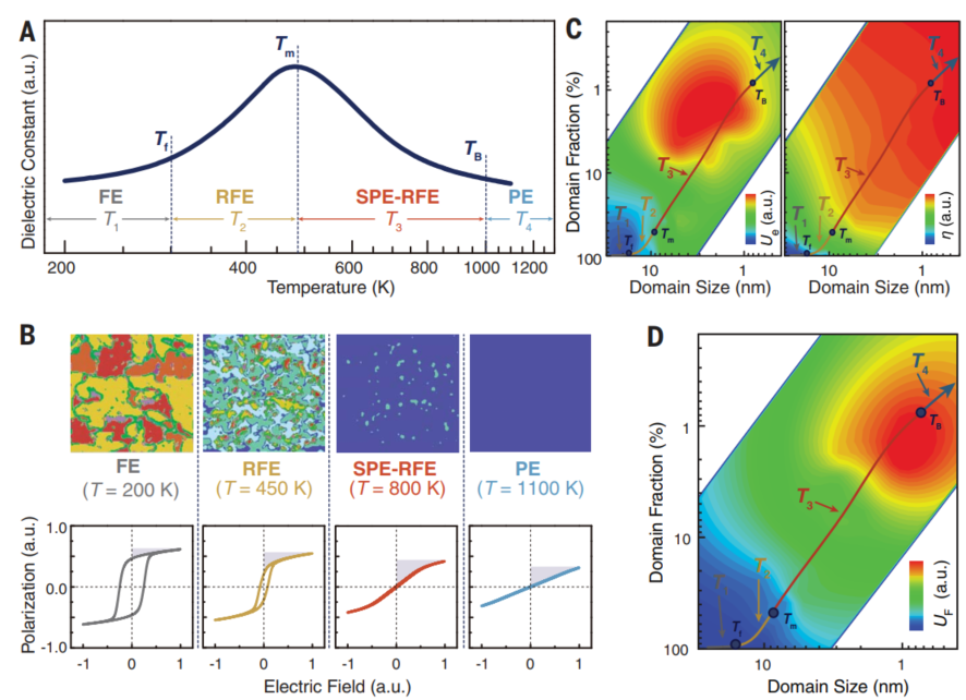 在这一工作中,团队提出超顺电态设计以抑制介电损耗、提升储能性能。与典型铁电材料(在相变温度以上电畴直接消失)不同,弛豫铁电体具有弥散的相变过程,在“平均相变温度”(对应介电常数最大值)以上很宽的温区内仍可以保持一定的极性电畴结构。在这一温区(即超顺电态)中,电畴体积相对于低温态进一步减小、耦合减弱,其翻转能垒可降至与热扰动同一量级,电畴因此可以更容易地发生极化翻转,从而显著抑制损耗。采用相场计算对多种弛豫铁电成分的模拟结果表明,在超顺电态温区中储能密度和效率可以实现综合优化(图1)。