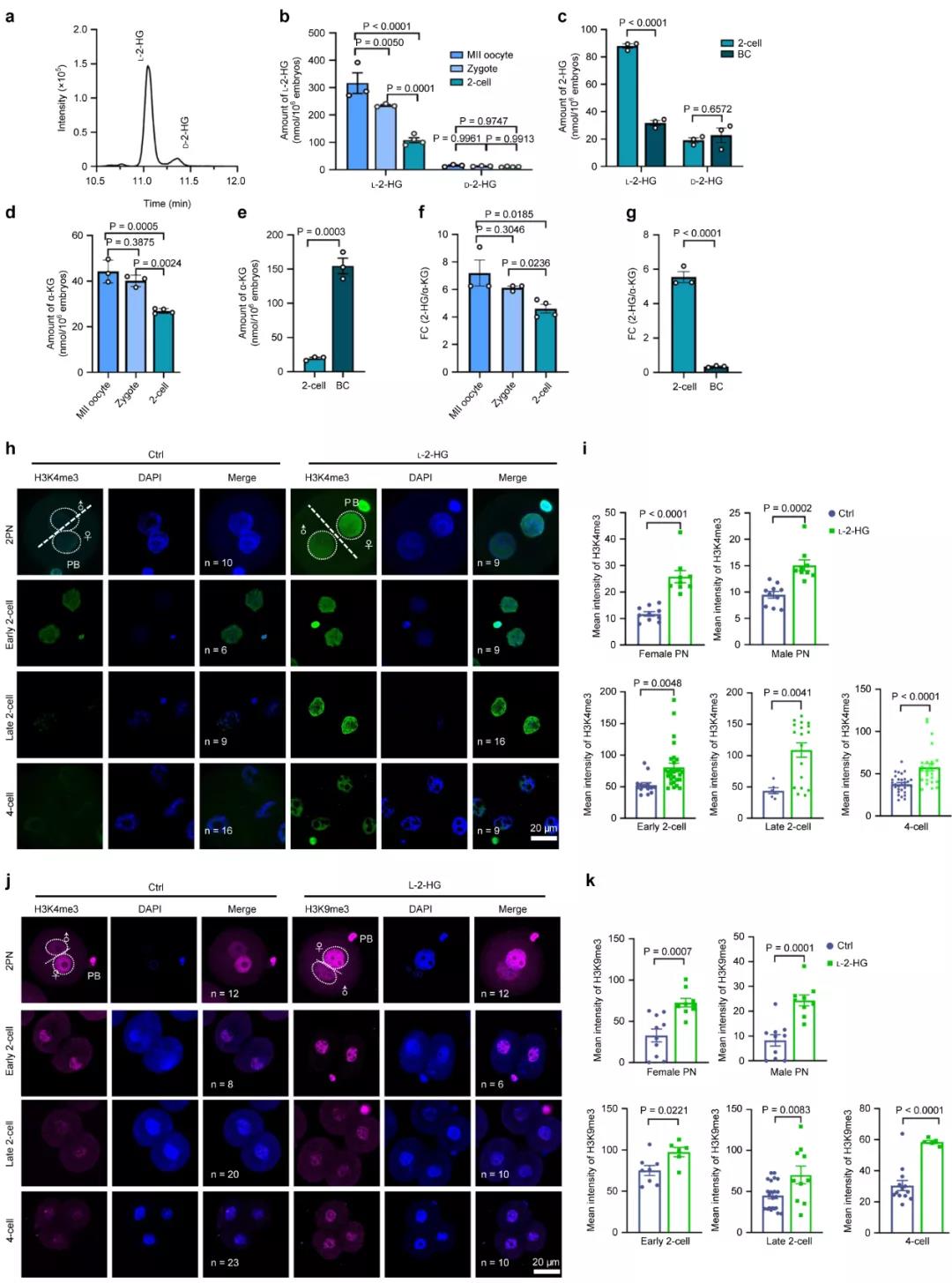 2-HG主要有D型和L型两种镜像异构体。研究团队首先采用LC-MS技术鉴定了胚胎中检测到的是通常生理条件下存在的L-2-HG。定量分析结果显示卵母细胞中L-2-HG含量高达mM级,且随着受精后胚胎的发育,L-2-HG含量逐渐降低。