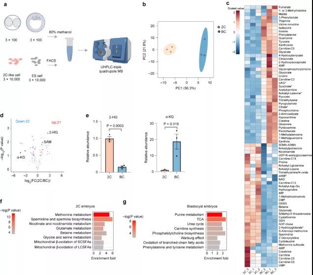 在本研究中,基于胡泽平课题组前期建立的超灵敏靶向代谢组学方法,研究团队首次在100个小鼠早期胚胎中开展代谢组学分析,探究了二细胞胚胎与囊胚的代谢特征差异。