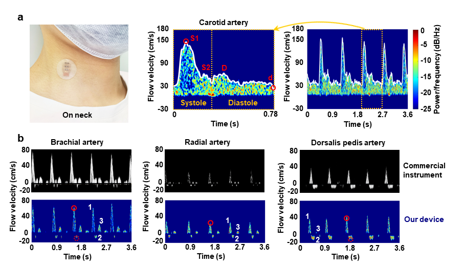 为了解决人体运动对多普勒发射角度带来干扰等难题,研究者采用双声束多普勒方法,实现对血流速度矢量与声束夹角的估计,对流速定量测量,这使得在血流速度测试前无需进行校准,提供血管截面内血流速度的绝对值。临床实验表明,柔性多普勒超声器件准确地捕捉到志愿者颈动脉血流特征,其准确性与商用彩超设备一致,并且可实现长期连续监测,无需中途校准。实验证实超声的穿透性能使器件能够检测到至少25mm深的动脉血流,远超过以光、热为技术的传统柔性电子器件探测深度。器件极低的重量使得其相比于传统探头,对皮肤的压强降低了2个数量级(仅约15Pa),避免了可能对患者造成的伤害,揭示了柔性器件在血管疾病等领域的巨大潜力。
