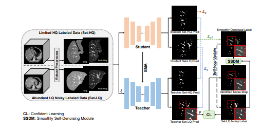 2018级数据科学与信息技术专业硕士生徐哲(指导教师:李秀教授)发表论文《含噪标注是财富——用于肝血管分割的均值教师辅助信度学习框架》(Noisy Labels are Treasure: Mean-Teacher-Assisted Confident Learning for Hepatic Vessel Segmentation),该论文的相关工作由李秀教授团队主导,腾讯天衍实验室和哈佛大学医学院共同完成。论文针对肝部CT图像中血管标注困难和分割标签中噪声大的问题,提出一种新型的均值教师-学生网络辅助的标签可信度学习框架,从带有噪声标注的数据集中提取关键信息,从而提升肝部血管的分割效果。