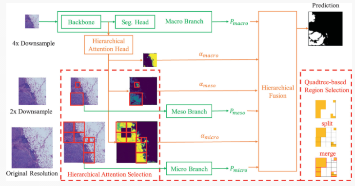 全场病理图像(WSI)中癌组织区域的分割是计算机辅助癌症诊断的重要步骤。然而,由于WSI图像的尺度过大,通常通过下采样成低分辨率图像或被裁剪成高分辨率局部图像块进行分析。独立处理高分辨率的局部图像块可能会忽略病理组织的全局关系,且推理速度较慢。使用低分辨率WSI图像分析可以扩大感受野,但会丢失局部细节。此工作提出了一个层次注意引导的多分辨率协同分割框架来解决上述问题。具体来说,该框架包含一个全局分析分支和若干个局部分析分支,以在不同的分辨率上执行WSI癌组织区域预测。作者让全局分析分支额外生成一个带有稀疏约束的层次注意图,用以融合多分辨率分割预测以获得更好的性能。在推理过程中,则利用稀疏注意图作为区域选择先验,采用四叉树加速策略选择重要的局部区域。在两个WSI数据集上的实验结果突出了该框架以下优点:能有效地聚合多分辨率信息以获得更好的病理图像分割结果;可以显著降低计算成本以加速预测而不降低精度;发现了不同的癌症种类具有不同分辨率的WSI图像响应偏好,体现了框架在计算机辅助癌症分析可解释性方面具备潜力。