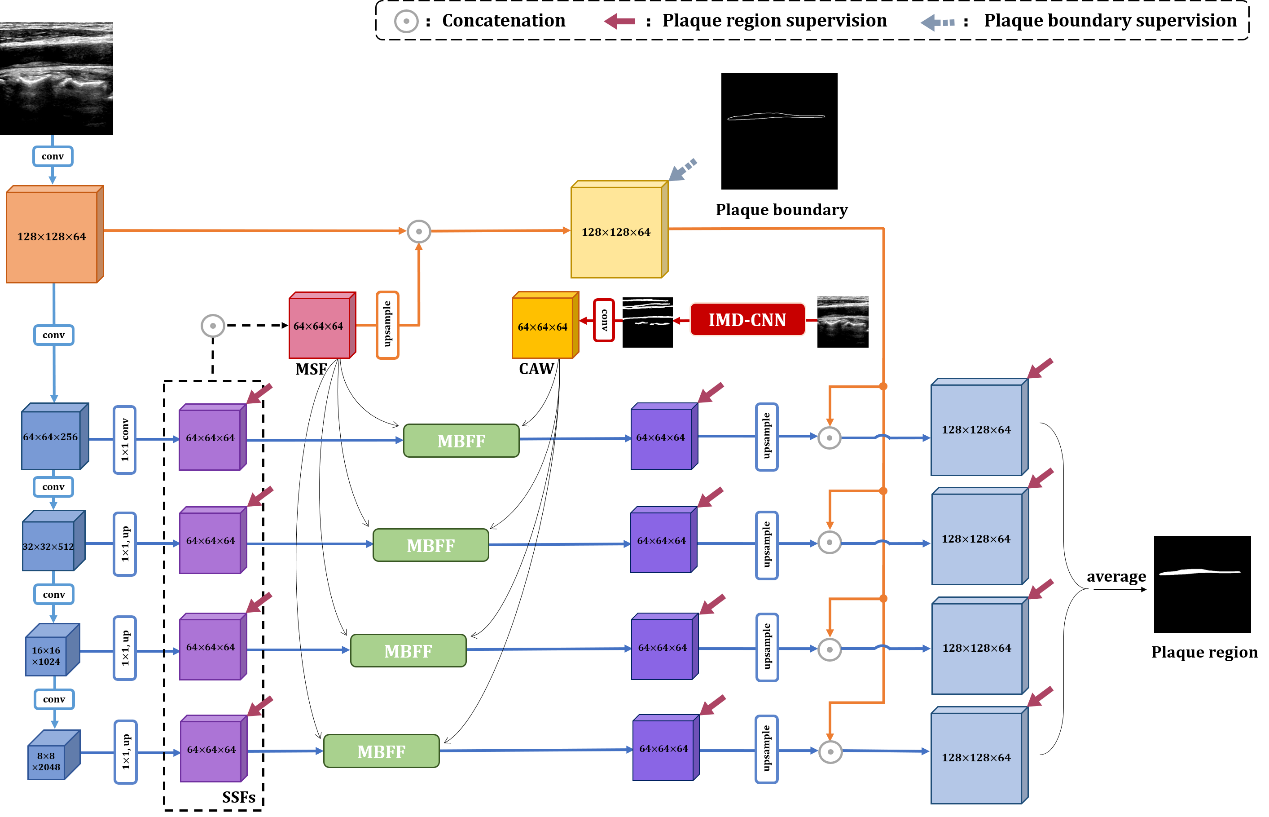 颈动脉粥样硬化斑块的检测对于缺血性卒中的预防和治疗具有重要价值,该论文着力实现超声图像中颈动脉斑块的自动分割。斑块的生成机理决定了斑块通常出现在血管壁的内中膜之间,因此模型融入了内中膜检测的前序工作,并将其作为先验信息辅助斑块分割。为了充分利用内中膜位置的先验信息,一个多分支特征融合(MBFF)模块被设计用来融合先验知识、提取超声图像的多尺度特征和每层特征的多尺度上下文信息。此外,论文提出一个边界提取结构来增强斑块边界,从而降低超声图像中病灶边界模糊的影响。对比实验结果显示MBFF-Net的斑块分割效果优于现有的分割网络。