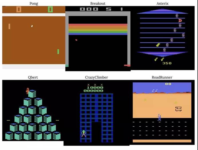 雅达利游戏是目前强化学习领域最常用的性能测试标准之一,它包含丰富的游戏场景,且各个游戏规则各异。在2015年,Deep Mind团队提出算法DQN,通过200M帧训练数据,在雅达利游戏上达到了人类平均水平。