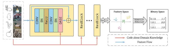 图1:DASE网络先结合模态信息将输入图像映射到512维的欧几里得空间,然后再将表征向量压缩至低维二值空间,加速检索过程。