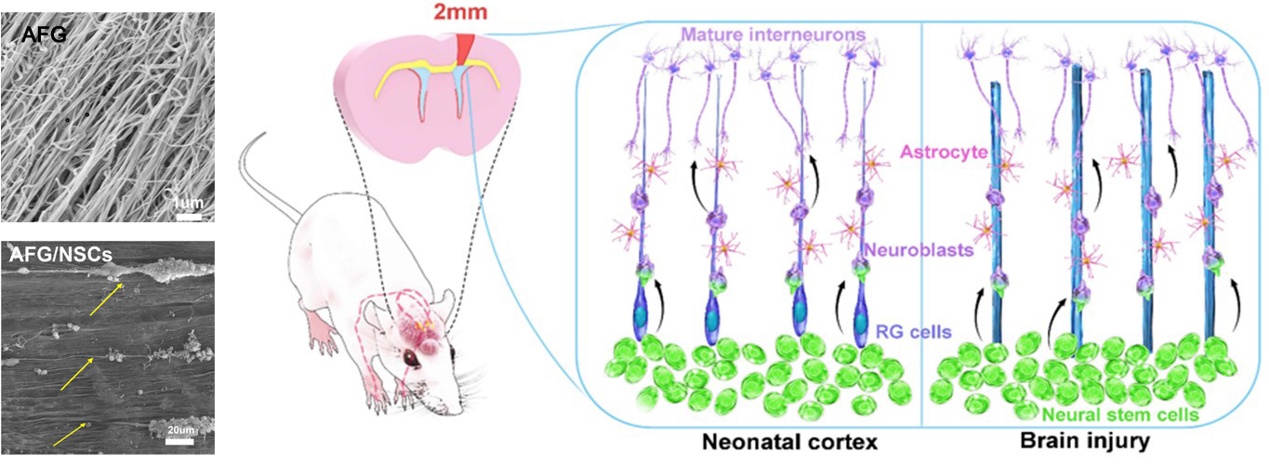 图1.AFG再生修复大鼠脑皮层损伤示意图AFG及体外培养神经干细胞的扫描电镜形貌(左);大鼠脑皮层损伤模型示意图(中);AFG纤维的排列结构模拟RG纤维取向(右);箭头表示神经干细胞的成熟过程