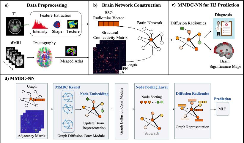 医学影像的智能化处理是精准个性化诊疗的关键。影像组学分析以无创、自动化及高效的方式为众多疾病的诊断和个体化治疗提供帮助,但大多在临床可解释性和实用性方面受到限制。《基于图扩散影像组学模型的脑干胶质瘤基因型预测》论文针对临床脑干胶质瘤患者个性化精准诊疗的需求,提出了一个可以直接融合肿瘤局部影像组学以及全脑结构连接网络的图扩散影像组学模型,可以辅助医生在术前无创地获取脑干胶质瘤患者的基因型相关信息,所提出的图扩散模型可以进一步发现潜在的病变脑区与受损脑连接,帮助医生解释患者临床表现。该方法可以帮助医生进行更加准确地开展术前诊断和治疗决策,为脑干胶质瘤诊疗系统新框架奠定了基础。