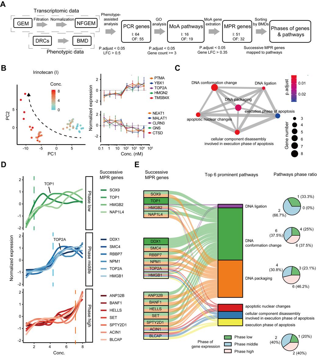 进一步地,本研究对药物伊立替康的用药机制进行了更加深入的探究(图3)。研究将筛选到的核心差异基因列出,并根据其随药物浓度变化顺序分成三个阶段,即分别在低、中、高浓度发生显著变化的基因集。之后,再将这些不同阶段的基因映射回通路,并计算各通路中各阶段基因的占比。研究发现,药物首先影响的是DNA构象改变的相关通路,之后影响到细胞凋亡的相关通路,这与伊立替康的作用机制符合。由此,Grouped-seq正确解析出了伊立替康作用于肿瘤类器官的药物作用机制。