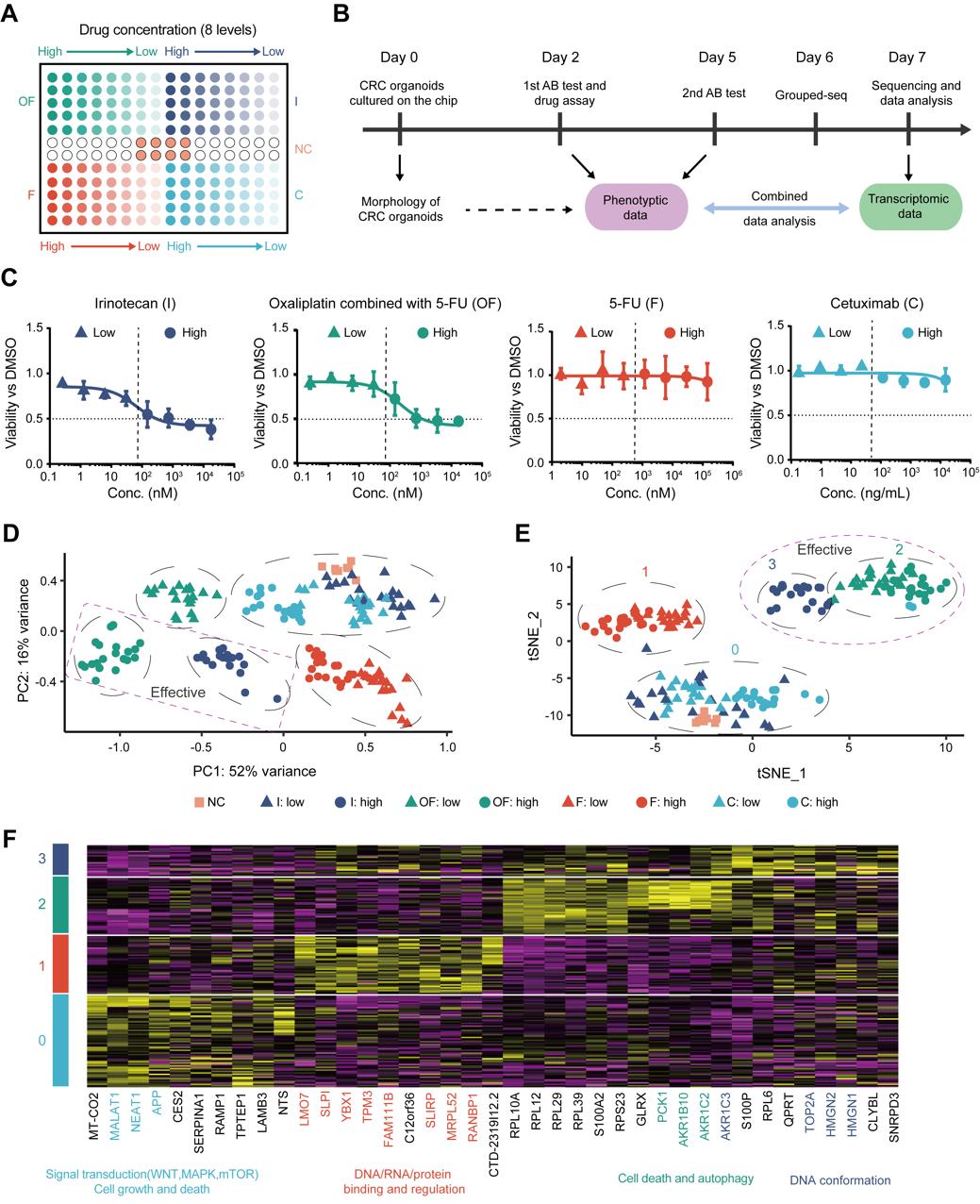 本研究利用结直肠癌类器官对Grouped-seq平台进行了验证(图2)。实验中,选取了结直肠癌临床上常用的四种药物,每种药物设置8个浓度,每种浓度设置5个重复,利用Grouped-seq得到表型信息和对应的表达谱信息,将二者联合后进行分析。表型结果显示,伊立替康、奥沙利铂联合氟尿嘧啶是两种有效药,因为在药物高浓度作用下,细胞活力下降明显。与之对应的,两种有效药高浓度的表达谱较对照组差别也是最大的。由此在宏观上证明了表型和表达谱是统一的,二者共同揭示药物的作用效果。