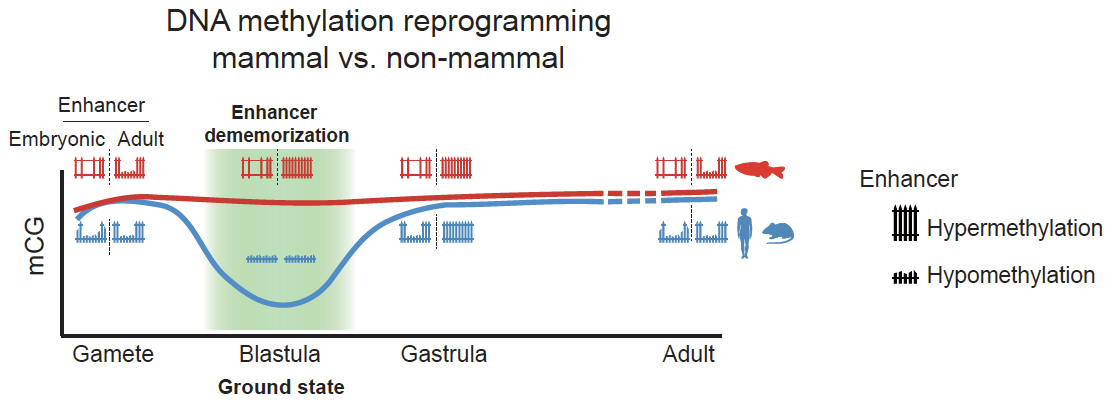 哺乳动物和非哺乳动物分别利用DNA甲基化整体擦除重建以及维持高DNA甲基化并实现增强子去记忆化擦除亲本表观遗传记忆和重置发育时钟