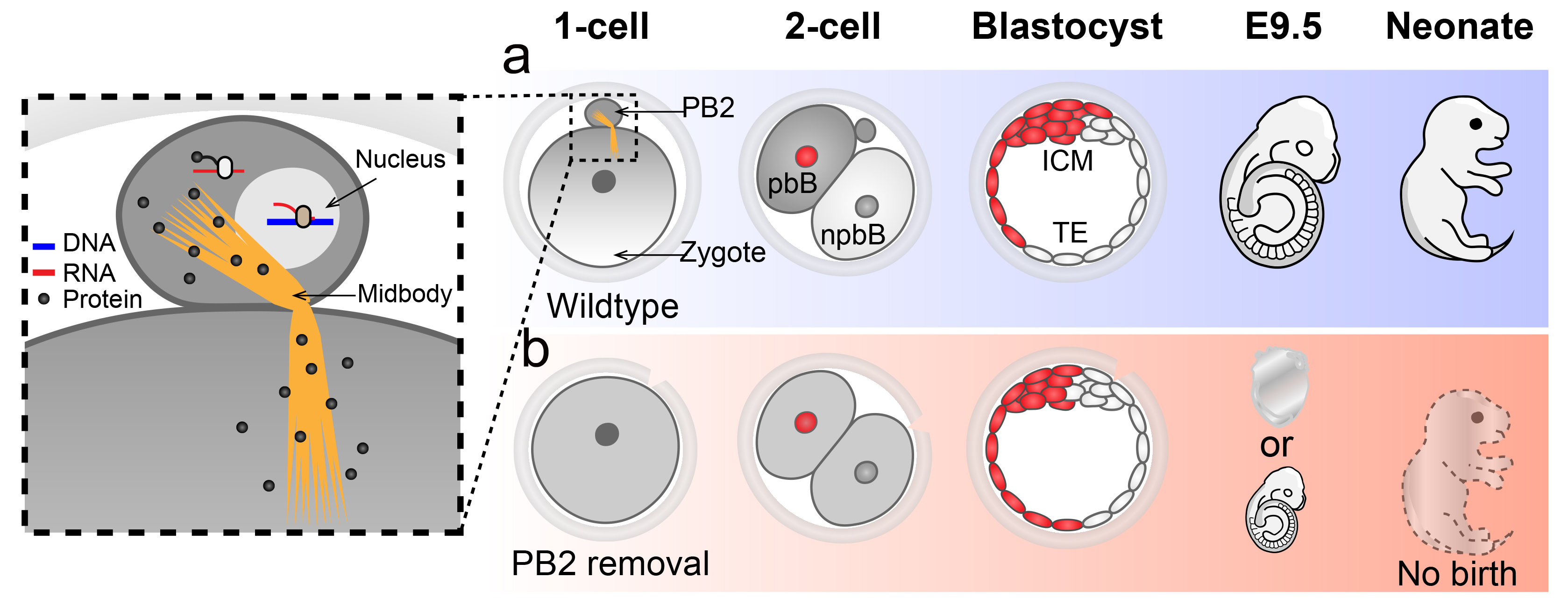 b.去除PB2后,2细胞期的pbB和npbB获得相同的发育命运,胚泡可能不能着床、着床后死亡、或发育迟缓并不能出生。