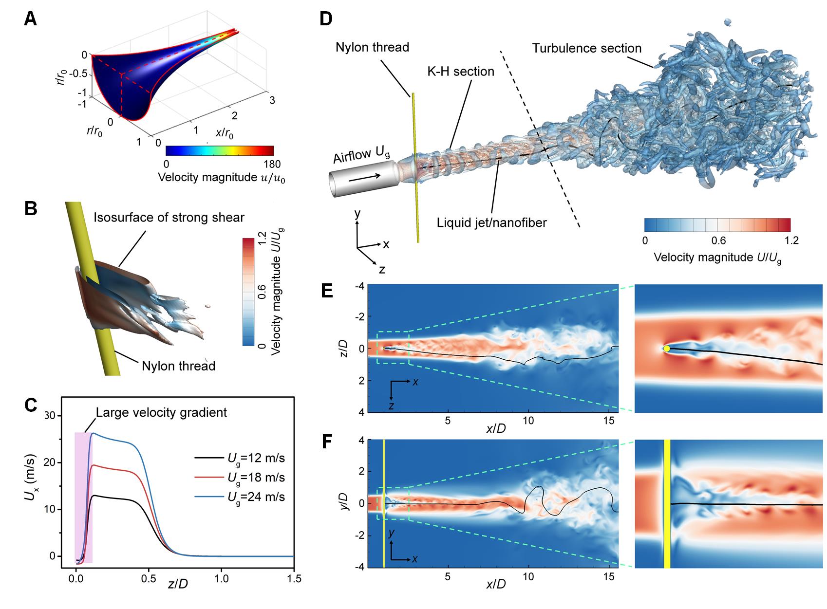 乐动(中国)网3月17日电 气相和液相高速流体之间的相互作用规律具有重要的基础科学意义;在实际生产中,气、液流的相互作用也具有重要应用价值,例如利用气流对液体溶液的高速剪切可以制备高性能纤维和粉体材料。在材料科学领域,纳米纤维具有独特的物理化学性质,成为最具吸引力的新型材料之一,在环境过滤、能源存储、柔性电子、组织工程和病毒防护等诸多领域发挥着日益重要的作用。为了实现先进纳米纤维材料的工业化应用,发展高通量、高效率、低成本、连续稳定的纳米纤维宏量制备方法具有重要的价值和意义。