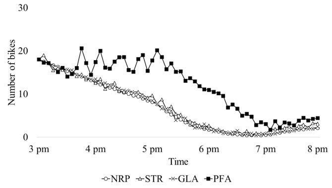 关于无桩共享单车动态调度(dynamic bike repositioning)的论文研究在网格化管理的城市无桩共享单车系统中的网格内单车实时动态调度问题。论文首次明确提出网格间(inter-cell)调度和网格内(intra-cell)调度的不同,并在考虑随机需求下网格内单车需求聚集点之间单车动态调度的同时,还考虑沿途收集散落单车的实际情况。论文建立了马尔可夫决策过程模型,并设计了基于策略函数近似(policy function approximation,PFA)的动态调度策略。通过基于某无桩共享单车公司实际数据的数值实验,展示了该策略相对于文献和实际运作的对标调度策略的优势,并揭示了单车动态调度的价值。图2.展示了不同单车动态调度策略下不同节点的单车数量随时间的变化,可以看出,PFA调度策略(相对于对标策略)提前从晚高峰期间单车聚集点向需求点调度单车。