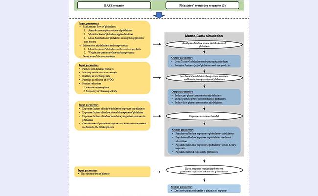 近日,乐动平台建筑学院赵彬教授与合作团队的最新研究成果揭示了在不同PAE使用限制情景下,归因于PAE暴露带来的2型糖尿病和肥胖症的疾病负担的减少特征,为制定合理的PAE使用限制政策提供了理论依据。研究团队采取自上而下的研究思路,基于我国消费PAE的质量流动数据,利用PAE“在用质量—室内浓度—人体暴露—疾病负担”这一顺序模型(图1),在严格至宽松的三种不同的PAE使用限制政策实施情境下,估计PAE所带来的成人2型糖尿病及肥胖疾病负担,并将之与未采用PAE使用限制政策的“基准”情境下的疾病负担作比较,得出相应的PAE使用限制政策所带来的健康效益。