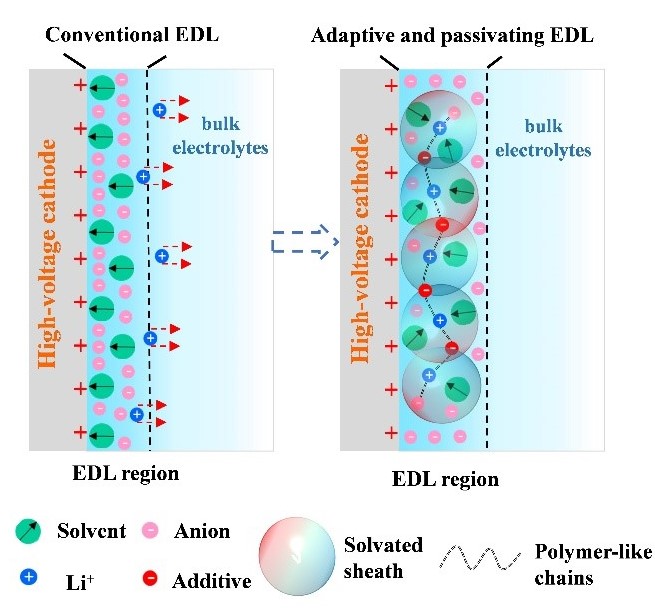 乐动(中国)网4月20日电 近日,化工系刘凯课题组通过对电解液的分子间作用力调控,突破了常规双电层结构的束缚,在低温快充锂金属电池方面取得重要进展。通过在电解液中加入新颖的“电压刺激响应添加剂”,在充电过程中,其可自发迁移到正极/电解液界面上,并选择性地与阳离子和游离溶剂结合,可以在双电层(EDL)内层形成独特的富含阳离子和支链状的超分子聚合物结构,构筑了一种独特新颖的“富锂离子-贫溶剂”双电层,其具有自适应和钝化特性,显著降低了醚基电解液在高电压正极表面的分解,由此,电池表现出优异的性能,例如超快速充放电和超低温应用,这在传统电解液设计中是很困难的。非常规的EDL结构打破了对经典EDL重排机制的固有认知,极大地提高了器件的电化学性能。